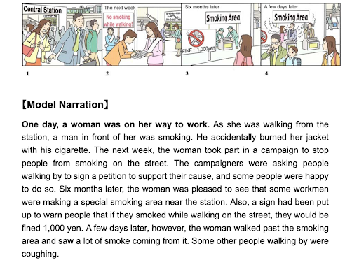 では、私が気付いたこの問題点とは何でしょうか?それは、魅力的かつ効果的な話をするために、どのように過去進行形と単純過去形を組み合わせて使うかということです。生徒さんたちは特に、場面を描写する際、進行形の使い方に苦労することが多く、単純過去形を使いすぎたり、名詞や複合名詞を多用する傾向があります。名詞句に重点を置くこの傾向は、ネイティブスピーカーが好むような進行形の主語と動詞構造の使い方ではなく、日本語訳に起因しているのではないかと考えています。